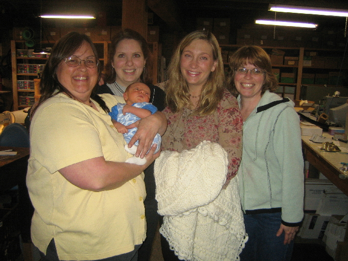 Our newest Soft Star Elf has joined the workshop! Baby Cruz (the little guy in the photo) was born 6 weeks ago at home. Pictured with him are adoring fans DeAnn, Dawn, Mama Trish and Leah during his first visit to the shop. Needless to say, we are all delighted with him!